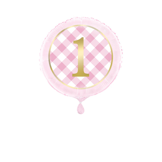 18in pkg Pink Gingham 1st Birthday Foil Balloon